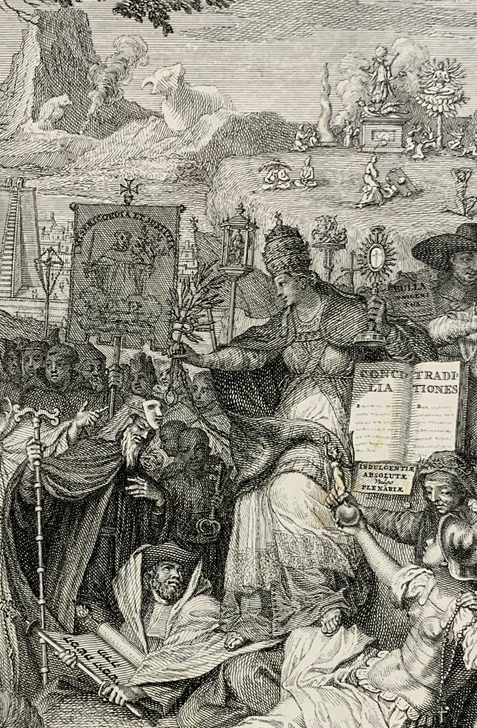 Bernard Picart, frontispiece for the Dutch edition of Cérémonies, engraving (details), in Cérémonies et coutumes religieuses de tous les peuples d monde, Amsterdam, 1727. Zentralbibliothek, Zürich, Q 35. © Courtesy Zentralbibliothek.